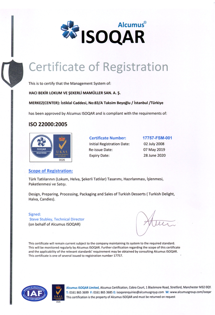 HACI BEKİR Firması, hedeflerini çalışan personelini eğiterek, tüm personelinin bilinçlenmesini sağlayacak ve Kalite, Çevre ve Gıda Güvenliği Politikasını sürekli gözden geçirecektir. HACI BEKİR Firması, bu politika ve hedeflerinin temiz çevre ve doğa içinde tahakkuk edeceğine inanarak bu hususları gerçekleştirmeyi ve geliştirmeyi taahhüt eder.
