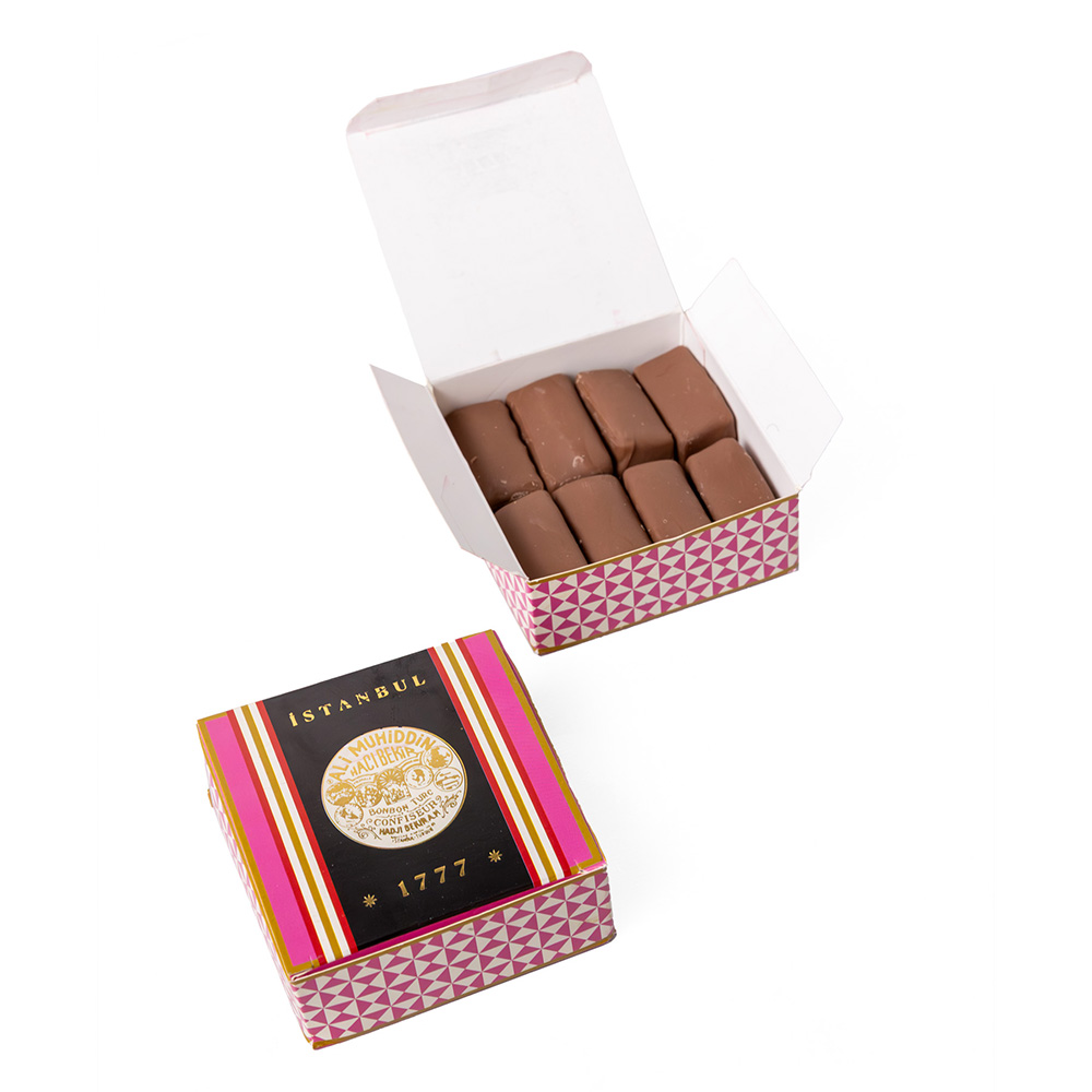 Ingredients: Turkish Delight (88%) Sugar, Corn Starch, Acidity Regulator (E336), Natural Rose Flavor (0.1%), Colorant (E 163). Milk Chocolate (22%) in Coating [(Sugar, Cocoa mass dried whole milk (milk chocolate contains at least 35% cocoa solids, at least 21% milk solids), emulsifier (lecithins-soy and Natural Vanilla Flavor]